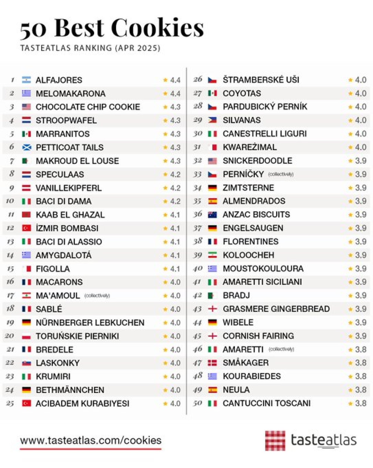 El reconocido portal gastronómico TasteAtlas acaba de publicar su ranking global de las 50 mejores cookies del mundo, y, para sorpresa de muchos (aunque no tanto para nosotros), el alfajor argentino se alza con el primer lugar. ¡Sí, leyeron bien! Este dulce tan emblemático de nuestra tierra se ha coronado como el mejor del planeta. Un reconocimiento internacional que no hace más que reforzar lo que todos ya sabíamos: el alfajor no es solo una delicia, sino un verdadero embajador de nuestra cultura.
