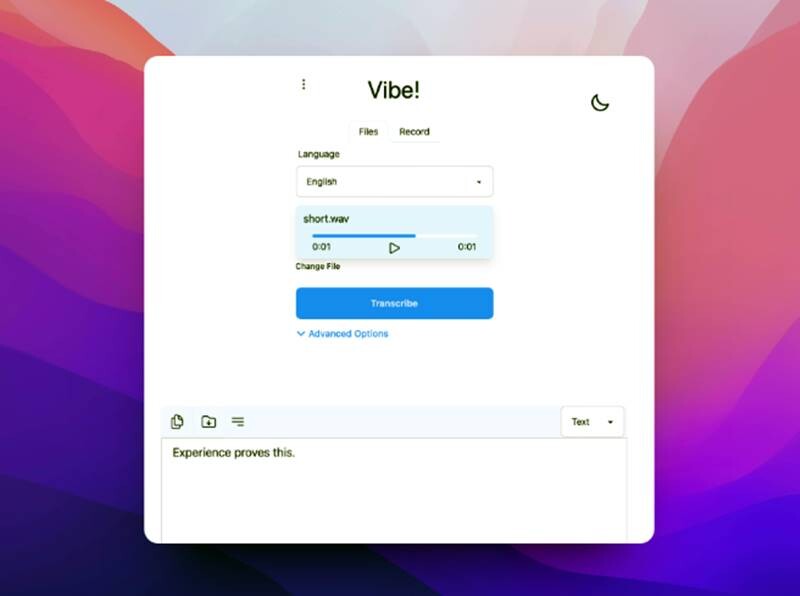 Una vez que se carga el audio o video, el usuario elige el idioma de la transcripción y hace clic en ‘Transcribe’. Así de simple. Pero, ¿qué pasa con la legibilidad del texto transcrito? Aquí es donde Vibe brilla realmente.